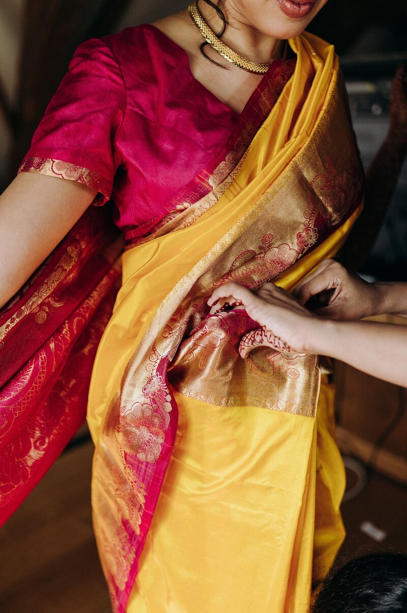 De bloemen speelden een grote rol in de styling en brachten kleur in elke setting. De tafel werd aangekleed met vintage vaasjes en tafelbloemstukken, die eerst tijdens de ceremonie werden gebruikt - een mooie manier om de bloemen optimaal te benutten. Daarnaast werd een extra gooiboeket voorzien, zodat Radhika haar bruidsboeket kon bewaren terwijl een ander boeket feestelijk door de lucht vloog.
